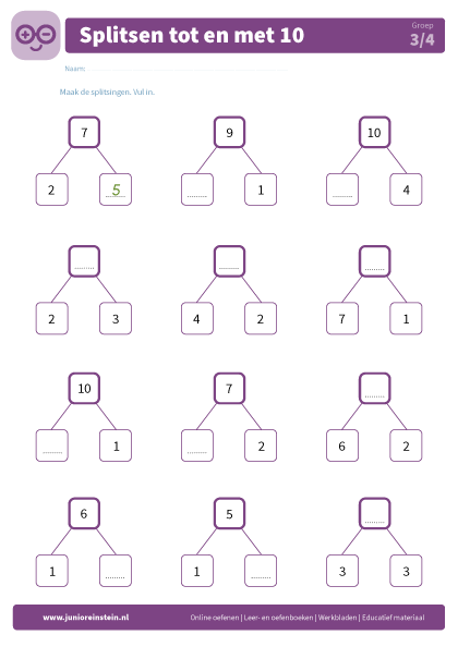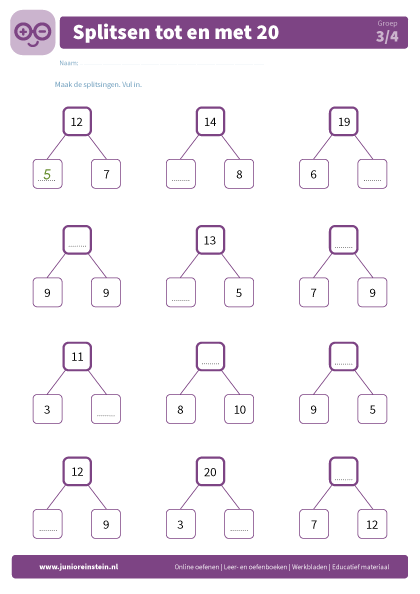 Met de splitstabellen op dit werkblad oefen je met splitsen tot en met 20. Kijk naar de getallen die er al staan en zorg dat de onderste getallen samen het bovenste getal maken. Veel plezier!